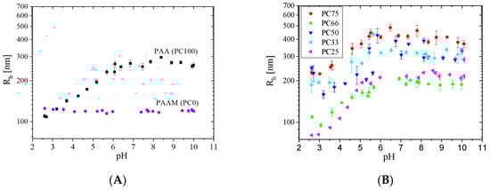 The hydrodynamic radius (Rh) of PAA/PAAM IPN MGs under varying pH, as revealed by DLS, is shown in Figure 2. The MGs of the neat PAAM (sample PC0, Table 1) showed no pH dependence, which was expected since they were neutral within the studied pH range (pKa of PAAm is ~15 []) (Figure 2A). The size of PAAM MGs was constant, being around ~200 nm for all studied pH values. In contrast, the Rh of the neat PAA MGs (sample PC100, Table 1) was pH dependent (Figure 2A) due to the ionization of the AA moieties (pKa of PAA is ~4.5–4.9 []). The Rh values of the neat PAA MGs gradually increased from ~200 nm at pH~2 to ~500 nm at pH~6, where PAA carboxyl groups are known to be almost entirely transformed into carboxylates []. A further increase in pH did not significantly affect the neat PAA MGs and their size remains ~500 nm up to pH = 10 (Figure 2A). The observed plateau indirectly confirms that most of the acidic groups in PAA were converted into carboxylate anions [] as well as that the MGs reached their maximum swelling ratio, which was limited by their chemical crosslinking.