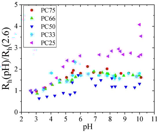 To illustrate the effect of the PAAM content on the Rh dependence of the pH outlined above, we created Figure 3. Here, the relative increase in the MG diameters, defined as the ratio (RpH/Rmin) between the hydrodynamic radius of IPN MGs at different pH (RpH) levels and the hydrodynamic radius of the same IPN MGs at the lowest pH = 2.6 (Rmin), is presented as a function of pH. As can be seen from Figure 3, the higher the PAAM content, the higher the relative increase in the Rh. For example, the MGs with a higher PAAM content (PC25) showed the strongest increase in their size as compared to their size at pH = 2, while on the contrary for PC75, the relative increase in MG size was not as big, which is fully in line with the explanation provided above.