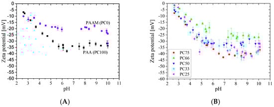 The pH dependence of ZP for the PAA MGs (PC100, Figure 4A) supports the results obtained for the pH dependence of their Rh (Figure 2A). In the following section, the absolute value of zeta potential |ZP|, reflecting the charge density, is discussed. Generally, the |ZP| of both PAA and PAAM MGs increased with increasing pH. The increase in |ZP| for PAA MG was due to the ionization of carboxyl groups, which reached a maximum at pH 6 and remained constant at higher pH levels. It was enhanced by the adsorption of negative ions (OH−), especially at low pH, when PAA was only weakly ionized. The isoelectric point (iep) at pH < 3 is typical for surfaces with dissociable acidic groups. Surfaces without dissociable groups normally exhibit an iep around pH 4 and—above pH 4—an increase in the |ZP| with increasing pH due to the adsorption of OH- ions on all surfaces. This should also account for PAAm. However, the measured iep of PAAM at pH << 2 is too low. An iep lower than that of the acidic PAA means that PAAM is more acidic than PAA. This low iep can therefore only be an effect of acidic contaminations by the surfactant or initiator—which, vice versa, could also affect the charge of the surface.