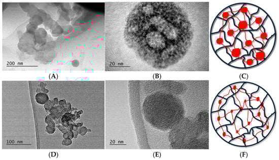 TEM images of PAA/PAAM IPN MGs with two different compositions: (A,B) PC75 and (D,E) PC25, with their respective schematical representations (C,F) (PAA (black) and PAAM (red)).