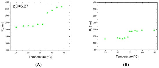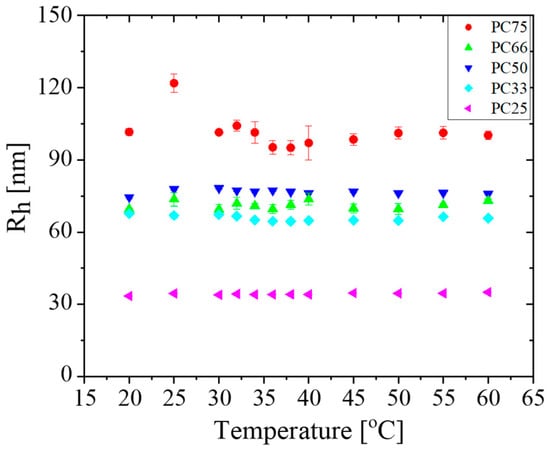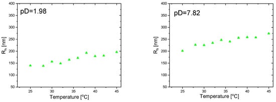 The NMR data indicate that the Rh of the PC66 MGs slightly increased linearly with increasing temperature and that the particle size was larger in alkaline media; however, the IPN MGs did not show temperature sensitivity in either acidic or alkaline pH in the studied temperature range (Figure 7). This result, obtained by NMR, was confirmed by DLS measurements made in distilled water at pH = 7 (Figure 8). This reveals that no real temperature responsiveness was observed for any of the IPN MGs at neutral pH.