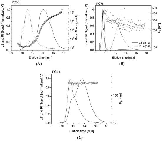 AF4 fractograms for samples PC 50 (A), molar masses (symbols) and PC 75 (B), and PC 33 (C), Rh (symbols); LS signal (solid line), RI signal (broken line) vs. elution time.