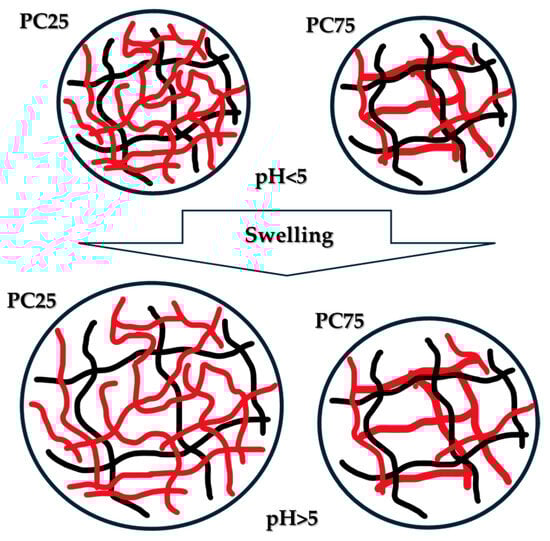 The IPNs’ composition also influenced the Rh of the IPN MGs (Figure 2B). The contribution of the second IPN component, PAAM, to the hydrodynamic radius of the IPN MGs can be seen by comparing the radii of the neat PAA MGs (Figure 2A) and of IPN MGs with a higher PAA content (e.g., PC75 and PC50, Table 1) (Figure 2B). The hydrodynamic radius of IPN MGs at pH > 5 was higher as compared to the neat PAA MGs, and this was due to the presence of the 2nd network PAAM, which physically increased the volume of the MGs—a larger polymer amount built up the IPN MGs as compared to the homopolymeric MGs. In addition, PAAM is a hydrophilic polymer superabsorbent, which imparts an additional swelling capacity in water to the IPN MGs.