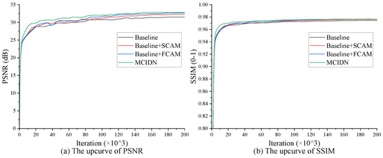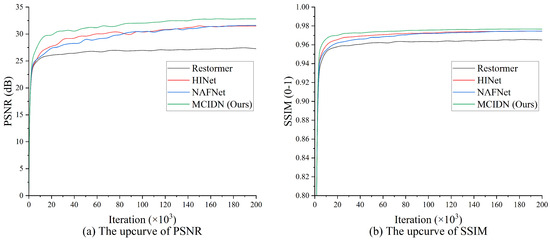 We compare the training process curves of our method with several state-of-the-art (SOTA) methods on the blurry metal corrosion dataset, as illustrated in Figure 6. The horizontal axis represents 20,000 iterations of the model. Figure 6a shows the PSNR curves for different methods as a function of iteration count, while Figure 6b presents the SSIM curves, with SSIM values ranging from 0 to 1. For enhanced visibility, the Y-axis for SSIM starts from 0.8.