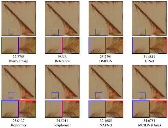 To validate the effectiveness of our multiple loss functions, we conduct a series of ablation experiments. Table 6 presents the contributions of each component in the loss function, demonstrating that every part enhances the model’s performance. When utilizing only the spatial domain loss function, the PSNR is 32.0136 dB. The inclusion of either the frequency domain loss or edge loss individually results in varying degrees of improvement in both PSNR and SSIM. This is because the frequency domain loss improves the network’s capacity to recover high-frequency information, resulting in clearer texture details. Simultaneously, the edge loss preserves sharp image contours and reduces blurring. When employing the total loss function, the PSNR and SSIM reach their highest values. These results indicate that our loss function plays a crucial role in deblurring metal corrosion images, enabling the model to more accurately reconstruct the corroded structures and edge contours.