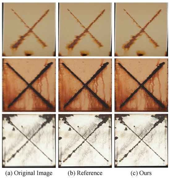 The model slices the blurry corrosion images into 256 × 256 patches for training, while the original image size is used for testing. Both training and testing are conducted on an NVIDIA Tesla V100 GPU. During training, random horizontal flipping and rotation are used for data augmentation. We employ the AdamW optimizer, with the beta parameters set to 0.9. The learning rate decreases from to using cosine annealing, and the weight decay is set to . MACs are tested on images with a patch size of 256 × 256.