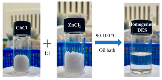 The DES was synthesized following a previous method [30]. Specifically, ChCl and ZnCl2 were mixed in a 1:1 molar ratio. Varying amounts of the ChCl:ZnCl2 DES (3 g, 9 g, 15 g, and 21 g) were prepared. These mixtures were prepared by combining the following amounts of each component: 1.52 g, 4.55 g, 7.59 g, and 10.63 g of ChCl and 1.48 g, 4.45 g, 7.41 g, and 10.37 g of ZnCl2, corresponding to the respective total DES weights. Subsequently, the mixture was then heated to 90–100 °C in an oil bath under continuous agitation until a homogeneous, transparent liquid phase was achieved, as illustrated in Figure 1.