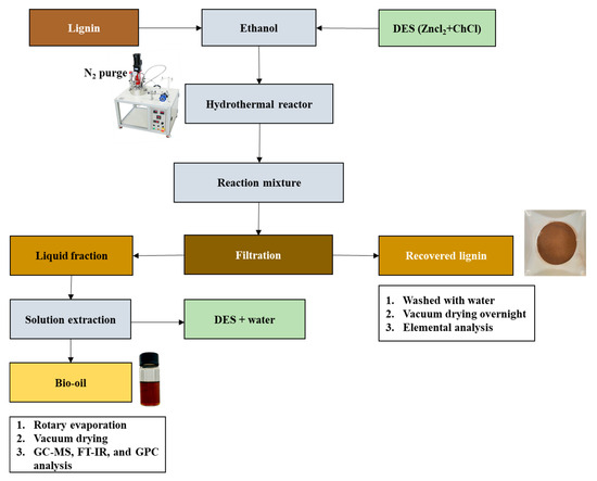 After cooling the reactor, the depolymerized product mixture containing both solid and liquid components was collected and then separated as shown in Figure 2. These solid and liquid phases were separated using filter paper. The solid phase, comprising the recovered lignin (RL) and DES, was washed with water to remove any residual DES and was then dried in an oven for 24 h. The liquid phase, containing the DES and bio-oil, was evaporated in a rotary evaporator to remove ethanol. Ethyl acetate was then added to the liquid phase to form a layer between the DES/water and bio-oil components. The organic (bio-oil) phase was then isolated using a separating funnel and further evaporated to remove the ethyl acetate. The yields of the liquid phase and RL were calculated using Equations (1) and (2), respectively: