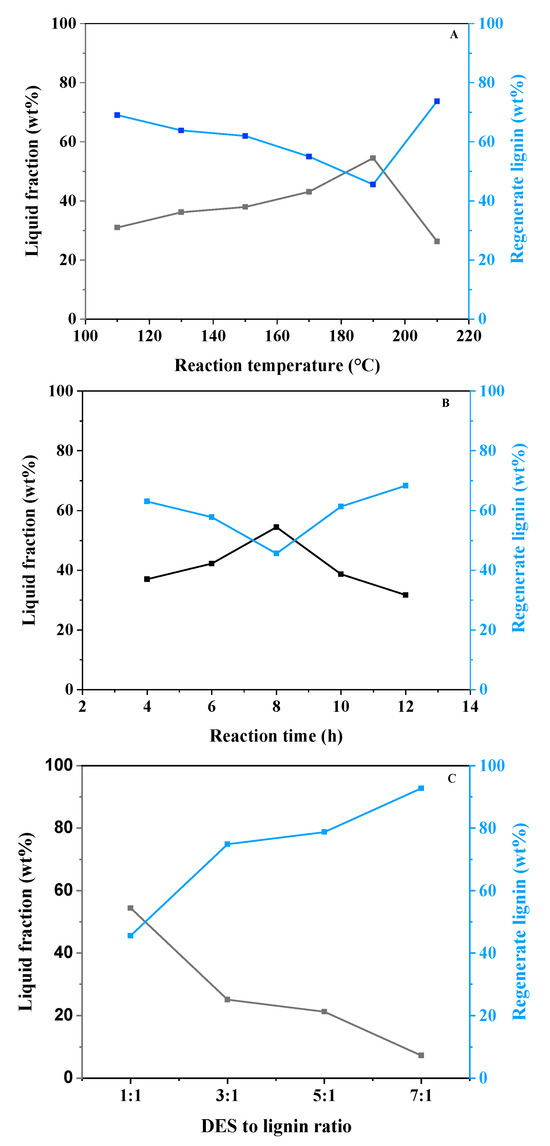 Effect of reaction (A) temperature, (B) time, and (C) DES-to-lignin ratio on the yield of depolymerized products. Reaction conditions for (A): 3.0 g of lignin, 8 h, DES-to-lignin ratio of 1:1, and 90 mL of ethanol; reaction conditions for (B): 3.0 g of lignin, DES-to-lignin ratio of 1:1, 190 °C, and 90 mL of ethanol; reaction conditions for (C): 3.0 g of lignin, 190 °C, 8 h, and 90 mL of ethanol.