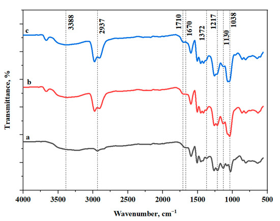 FT-IR spectra of the raw KL (a), RL sample after DES treatment at 190 °C for 8 h (b), and RL sample without DES treatment at 190 °C for 8 h (c) in ethanol.