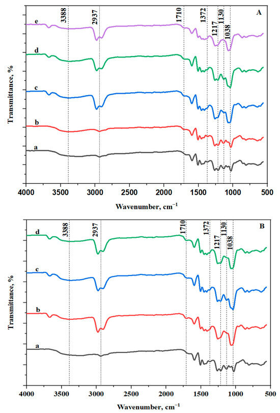 FT-IR analyses were performed on the RL samples to examine potential chemical modifications induced by the DES during depolymerization. Figure 4 illustrates the FT-IR spectra of the KL feedstock and RL obtained from the DES treatment of KL. Notably, the peaks at 3388 cm−1 correspond to the hydroxyl groups (O–H) of aliphatic and aromatic compounds. Compared to the untreated residue and original KL, the peak intensity appears diminished for the RL obtained from the DES treatment, indicating a reduction in hydroxyl groups following DES treatment [37]. The twin peaks at 2937 cm−1 correspond to the C–H bonds of methyl and methylene groups [38]. The intensities of these peaks also decrease for the DES-treated RL, indicating a weakening of C–H bonds during DES processing. The carbonyl peak at 1670 cm−1 corresponds to the stretching vibrations of the C=O functional group, which is associated with the lignin side chain conjugated with aromatic compounds [39]. The peaks at 1372 cm−1 are attributed to phenolic hydroxyl groups [40]. Compared to the non-DES-treated RL, the peak at 1038 cm−1 diminished for the DES-treated lignin, suggesting effective lignin depolymerization. Furthermore, the peaks at 1217 cm−1 correspond to guaiacyl rings [41]. The reduction in the intensity of the guaiacyl peak for the DES-treated lignin sample indicates that lignin depolymerization decreases the guaiacyl unit concentration. Figure 5A,B illustrate the FT-IR spectra of the raw KL and RL obtained from the DES treatment of KL at different reaction temperatures and times. The most notable changes were observed in the RL obtained from KL depolymerization at 190 °C with a DES-to-lignin ratio of 1:1 for 8 h. Noticeably, the decrease in the 1038 cm−1 peak for the regenerated lignin sample after the DES treatment in ethanol at 190 °C for 8 h suggests that ether bonds in the lignin structure have been cleaved or significantly altered. This could be due to the solubilizing action of the DES and ethanol, combined with the high temperature, which leads to the depolymerization or degradation of lignin.
