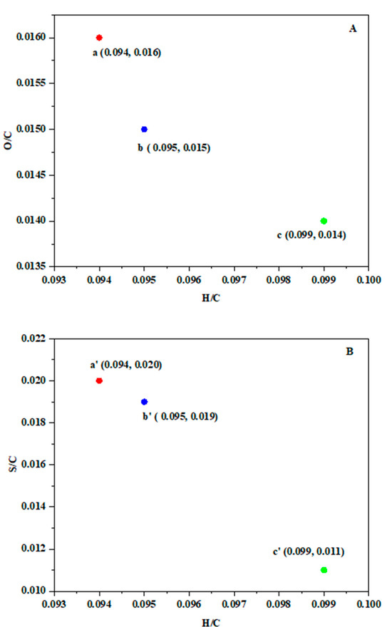 Van Krevelen diagram comparing KL and RL (A,B). The O/C vs. H/C and S/C vs. H/C ratios of (a, a’) KL. The O/C vs. H/C and S/C vs. H/C ratios of RL obtained at (b, b′) 190 °C for 8 h without DES, and (c, c’) 190 °C for 8 h using DES.