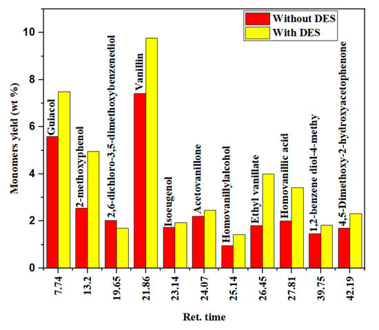 A GC–MS analysis was performed to identify the depolymerization products present in the liquid phase derived from the DES-assisted KL depolymerization conducted in ethanol at 190 °C for 8 h. Initially, 80 compounds were identified; however, among these, the 10 most representative ones were selected to compare the performance of various DES systems. The identified products primarily included aromatic monomers derived from syringyl and guaiacyl units. In the liquid fraction of the non-DES-treated bio-oil (Figure 7), several phenolic derivatives were detected, including guaiacol (5.59 wt%), 2-methoxyphenol (2.54 wt%), vanillin (7.77 wt%), acetovanillone (2.2 wt%), ethyl vanillate (1.81 wt%), homovanillic acid (2.01 wt%), and 1,2-benzenediol-4-methyl (1.6 wt%). Notably, these compounds originate from the cleavage of β-O-4 linkages in the guaiacyl units of lignin [13]. In addition to these, a substantial amount of isoeugenol (0.43 wt%) was detected. Interestingly, following treatment with the (ChCl:ZnCl2) DES, the yields of all detected compounds increased considerably in the liquid fraction. This suggests that the (ChCl:ZnCl2) DES enhances the alkylation, hydrogenation, and decarboxylation reactions of the unsaturated and oxygenated monomers in the liquid fraction, thereby increasing the yields of the resulting compounds.