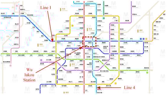 Wulukou station, situated in the New City District of Xi’an, serves as a stop on both Line #1 and Line #4 of the Xi’an Metro. As illustrated in Figure 1, the station is geographically positioned between the east-facing city wall of Chaoyangmen and the north-facing Xi’an Railway Station. Functioning as a critical junction between these two significant landmarks, Wulukou station is surrounded by a variety of snack streets and prominent shopping centers, including the notable Wanda Plaza. The Xi’an Subway Line #1 commenced its operations on 16 September 2013, while Line #4 was officially inaugurated on 26 December 2018. As a convergence point for both newly established and existing metro lines, Wulukou station features a more complex and diverse structural configuration compared to stations serving a single line. This complexity allows it to address common challenges and unique scenarios associated with urban rail emergency evacuations, thereby highlighting its considerable research significance. Consequently, this study has chosen Wulukou station as the focal point of investigation.