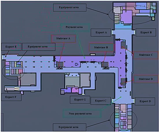 Given that elevators typically become non-operational during emergency situations, they have been excluded from the model. The station features a total of seven entrances and exits, designated as A, B, C, D, E, F, and G, as illustrated in Figure 2. The widths of these exits are uniformly set at 5.6 m for six of them, while one exit is slightly narrower at 5.3 m. In conjunction with these exits, two sets of security inspection equipment for entry and exit have been implemented. The station is equipped with two ticket counters and eight automatic ticket machines, with plans to expand this number to twelve in a future development phase. Additionally, there is one automatic ticket-checking machine currently in operation, with a total of eight entry ticket-checking machines planned for construction, which will increase to ten as new lines are introduced. Furthermore, the station has eight exit ticket-checking machines, with the intention to expand this number to fifteen during the subsequent expansion phase in anticipation of emergency evacuations during periods of high passenger volume. The station includes two standard bidirectional gates.