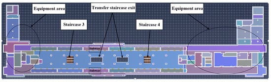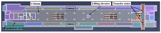 Regarding the structural characteristics of Wulukou metro station, the platform configuration is characterized by a three-level island platform design. The station experiences fluctuations in passenger flow, with distinct peak and off-peak periods; detailed passenger flow rates will be discussed in the subsequent section. The station’s smoke control and exhaust systems adhere to established regulatory standards. It is important to note that this simulation does not account for variations between the station’s platforms and concourse. As illustrated in Figure 3, the platform for Line #4 is designated as a rectangular area measuring 161.56 m by 14.0 m. Similarly, Figure 4 depicts the platform for Line #1 as a rectangular area measuring 113.21 m by 13.552 m, with the total area of the main building amounting to 10,048.70 square meters. The total architectural footprint of the station is 14,714.93 square meters; however, after excluding non-functional passage areas such as stairs and escalators, the effective evacuation area available for personnel within the station is 2261.84 square meters.