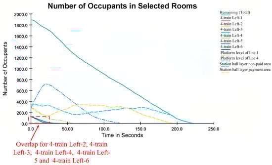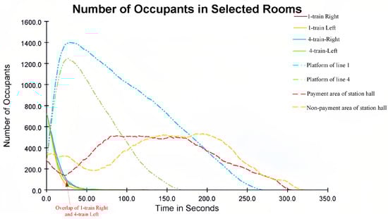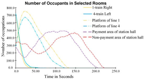 As depicted in Figure 12, the evacuation patterns observed in the train areas of Line #1 and Line #4 demonstrate similar trends; however, the disembarkation rate of passengers on Line #1 is slightly higher than that on Line #4. The time required for all passengers from Line #4 to access the platform is 80 s, whereas it is only 50 s for Line #1. Furthermore, the passenger flow on the platform levels of both lines exhibits a similar trend, with Line #1 achieving a maximum of 756 passengers and Line #4 reaching a peak of 674 passengers. In the station hall, the highest occupancy recorded in the paid area is 495 individuals, which is marginally greater than the 470 individuals noted in the non-paid area. The presence of gates in the paid area may contribute to a certain level of congestion that affects the evacuation flow of passengers.