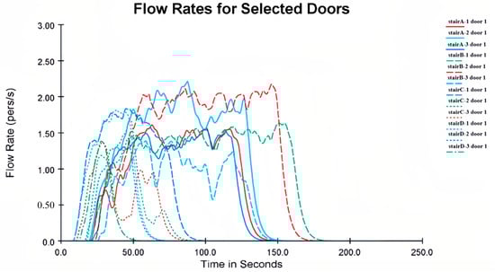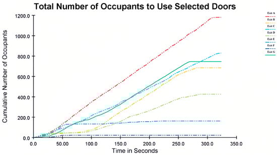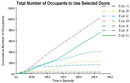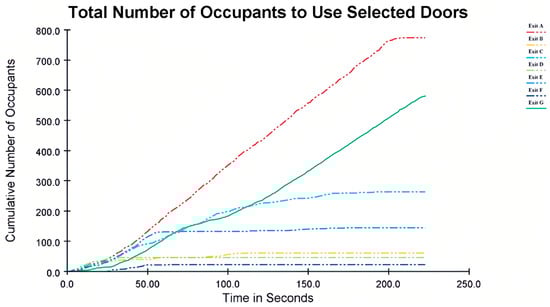 Figure 17 illustrates the utilization status of the various exits. The passenger flow rate at Exit A ranges from three to five individuals per second, demonstrating a consistently high level of passenger movement throughout the evacuation process. The total number of evacuees ultimately reaches 1180. The simulation indicates that significant congestion occurs near the gates adjacent to Exit A. Exits B, C, and G also display elevated utilization rates, with cumulative evacuation counts of 686, 829, and 746 passengers, respectively. In contrast, Exits E and F exhibit the lowest utilization rates, with cumulative evacuation counts of 163 and 23 passengers, respectively. Within the designated timeframe, these exits reach their maximum capacity, and after 60 s, there is no further passenger flow through Exits E and F. Therefore, it is recommended that attendants be deployed to direct passengers toward Exits E and F, as this could facilitate a more efficient evacuation process.