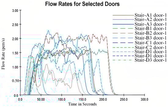 An examination of the data presented in Figure 10 reveals that for Staircase A, the left escalator achieves a maximum passenger flow rate of 1.61 individuals per second, the middle escalator reaches 2.21 individuals per second, and the right escalator attains 1.54 individuals per second. In the case of Staircase B, the left escalator records a maximum flow rate of 1.63 individuals per second, the middle escalator registers 2.18 individuals per second, and the right escalator has a maximum flow rate of 1.39 individuals per second. For Staircase C, the left escalator’s maximum flow rate is 1.84 individuals per second, the middle escalator’s is 1.68 individuals per second, and the right escalator’s is 1.37 individuals per second. Lastly, for Staircase D, the left escalator achieves a maximum flow rate of 1.82 individuals per second, the middle escalator reaches 1.42 individuals per second, and the right escalator records 1.38 individuals per second.