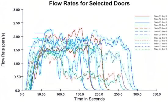Table 10 presents a summary of the simulation outcomes. Within the context of this study, Scenario #1 illustrates a condition marked by a reduced influx of passengers at the station, resulting in a total evacuation time of exactly 222.8 s. In contrast, Scenario #3 reflects a situation characterized by the highest observed passenger influx, leading to a cumulative evacuation duration of 323.5 s. Importantly, both scenarios adhere to the six-minute standard established by current national regulations, indicating that the evacuation capabilities of the Wulukou subway station are robust and compliant with safety standards.