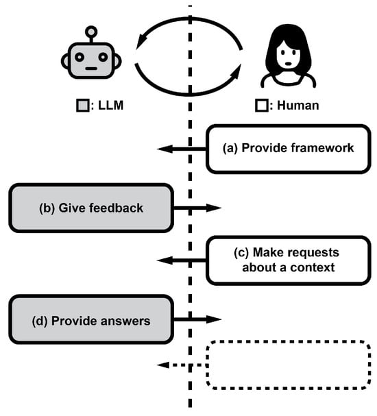 Diagram showing the step-by-step interaction between a human user and an LLM-based system through structured prompt engineering. Initially, in phase (a), “Provide framework”, the user defines a general structure for the LLM, setting broad guidelines. In phase (b), “Give feedback”, the LLM generates initial outputs, which the user refines through feedback, enhancing precision. Phase (c), “Make requests about a context”, involves the user specifying details to tailor the framework to the task’s unique needs. Finally, in phase (d), “Provide answers”, the LLM delivers detailed solutions aligned with both general principles and specific task requirements, illustrating a responsive and adaptive workflow that enhances the LLM’s effectiveness. The entire process can be subject to continuous feedback loops at each intermediate stage and can virtually extend indefinitely, as summarised by the curved arrows between the two agents and the dashed box, respectively.
