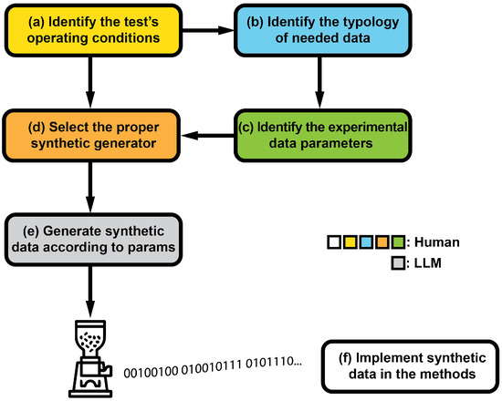 Synthetic data generation workflow depicting each stage of the process. In (a), yellow box, “Identify the test’s operating conditions”, initial conditions and requirements are set, establishing the data generation foundation, including scope and constraints. In (b), cyan box, “Identify the typology of needed data,” the necessary data type for the research is specified, distinguishing between structured and unstructured formats. In (c), green box, “Identify the experimental data parameters”, key parameters such as data distribution and consistency levels are defined. In (d), orange box, “Select the proper synthetic generator”, the appropriate tool for data generation is chosen based on the data type and parameters, such as using a language model for text or parametric tools for statistical data. In (e), grey box, “Generate synthetic data according to params”, data are produced according to the specified characteristics. Finally, in (f), white box, “Implement synthetic data in the methods”, the generated data are integrated into research methods for testing and validation. This streamlined approach ensures robust, tailored data generation for effective testing under controlled conditions. All the boxes, except the grey one, correspond to actions performed by human agents.