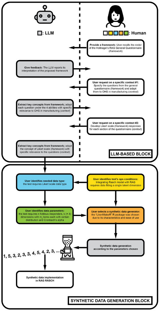 Step-by-step workflow illustrates the interaction between a human user and an LLM-based system within a structured prompt engineering and synthetic data generation framework. The two blocks constituting the proposed methodology are clearly highlighted. Initially, the user sets a basic framework based on Hollnagel’s RAG general questionnaire for OHS relevance. The LLM then provides feedback to refine its model interpretation. Next, the user requests contextual adaptations to tailor the questionnaire for OHS in manufacturing, leading to the LLM adjusting questions to reflect four core OHS competencies. Further, the user requests Likert scale responses, specifies the type of data required, and sets test conditions to fit a Rasch model, including specifying data parameters like the number of responses and Cronbach’s alpha for consistency. The “LikertMakeR” R package is chosen to generate data fitting these criteria, producing a data set that mimics real-world OHS scenarios in manufacturing. These data are then implemented within the RAG-Rasch framework for testing and validation, completing a robust, context-specific methodological workflow for early-stage OHS methodology testing. The colour code in use corresponds to that in Figure 2.