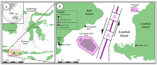 Study area: (a) middle part of Indonesia where ASL II is located; (b) Lombok Strait, TSS, and PSSA.