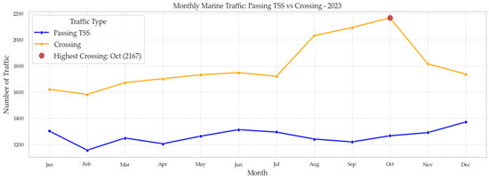Figure 4 depicts the monthly trend of marine traffic in the strait throughout the year. The passing traffic is relatively stable, in contrast to the crossing traffic, where a noticeable increase in August to the highest number in October can be seen. Therefore, since it was the densest month of the year, 7 d AIS data in that specific month were utilized in this study.