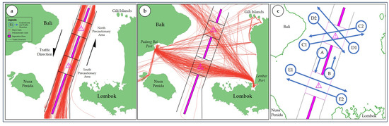 Movement of marine traffic in the Lombok Strait. (a) Passing ships; (b) crossing ships; and (c) coded route according to traffic direction.