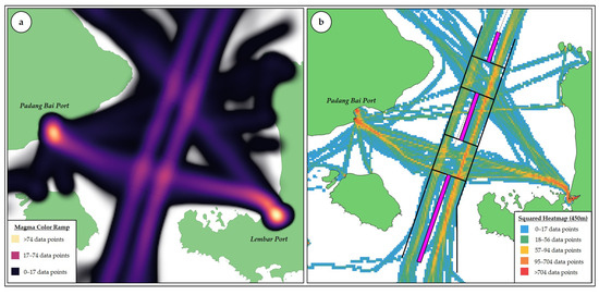 Kernel density estimation (KDE) visualization of the marine traffic in the research area using GIS; (a) magma color ramp heatmap with 10 mm radius and (b) heatmap with each square representing an area of 450 m.