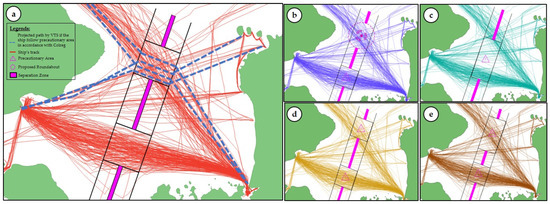 Movement of marine traffic in the precautionary area; (a) ship’s path emphasized by the VTS to be followed by crossing ships; (b) roundabout option; (c) combining both precautionary areas into a single channel 13 nm in length; (d) shifting the northern precautionary area by 1.5 nm to the north; and (e) expanding the northern precautionary area by 4.5 nm in length.