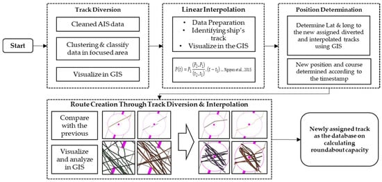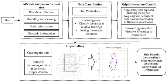 Prior to converting the northern precautionary area into circular roundabouts, we conducted a ship domain analysis to determine the semi-major (x) and semi-minor (y) axes, which must be determined to calculate the round-out capacity in the next section of this study. The steps used to determine the roundabouts are shown in Figure 8.