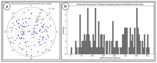 Visualization of ship encounters in the northern precautionary area; (a) encounter situation relative to the distance to the target ship and (b) relative bearings of the target ship.
