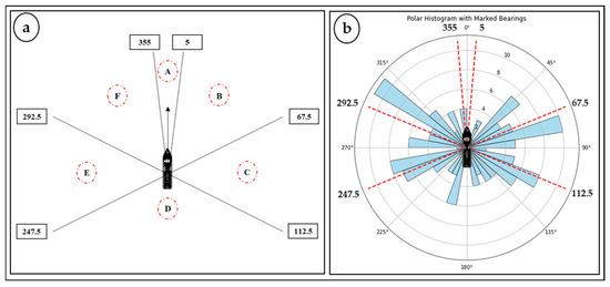 Bearing angle of the target ship relative to the own ship; (a) bearing angle classification and (b) histogram of the relative bearing in the own ship 360-degree perspective.