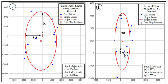 According to [41], a head-on situation occurs in sector A, crossing situation in sectors B, C, E, or F, and overtaking situation in sector D. Give-way rules require the own ship to give way if the target ship’s course falls within sectors A, B, or C, while the target ship must give way if its course is in sectors D, E, or F depicted in Figure 10a. The highest number of target ship bearings in the histogram in Figure 10b falls within the bearing range of sectors C, E, and F (blue colored bars), which translates into own ships and target ships are in a crossing situation. This result also shows a significant relationship between the number of crossing ships and number of passing ships, as listed in Table 1. After the analysis and classification of the interaction of ship encounters in the focused area, the determination of the ship domain proceeds to the ellipse fitting of the target ship distances and relative bearing. In this study, all size of passenger ship/ferry RO-RO is treated as a crossing ship; and all cargo ships over 200 m in length is treated as the passing ship. The cargo ships over 200 m in length according to [42] are classified as Aframax (for oil tankers), Suezmax, Panamax, and Capesize (for bulk carrier). These types of ships represent the highest amount of traffic in the focused area. The basis of the calculation with the result of the ellipse fitting is shown in Figure 11.