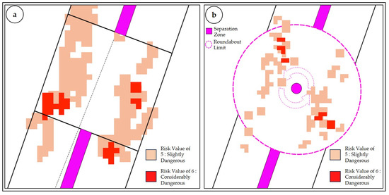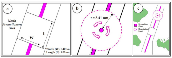 With a width of 5.40 nm and length of 5.02 nm, the area covered by the rectangular precautionary area was 27.10 nm2, while the slightly elliptical roundabout conversion resulted in an area of 42.67 nm2. The separation zone in the center of the roundabouts was designed based on the width of the existing TSS separation zone. This center-separating zone provides the maximum allowable space for the maneuverability of ships in roundabouts. This design also accommodates for the most natural path of the ship considering speed, in line with the approach in road transport, where the central island of a roundabout serves as a speed reduction zone, and carefully optimizes geometric layout to create the smoothest and flattest path for vehicles considering their natural movement trajectories, entry curves, and the fastest path for a single vehicle to balance safety and efficiency [11,44].