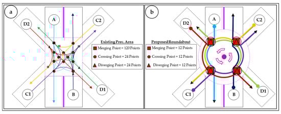 Roundabouts have become an essential element of road transportation infrastructure because they can enhance traffic flow and improve safety at intersections. The adoption and regulation of roundabouts are informed by extensive guidelines and empirical research that emphasize their advantages and optimal approaches in terms of design and implementation. A study [9] at the Transport and Road Research Laboratory investigated the capacity of roundabouts and created mathematical models that used real-world data to forecast the maximum number of vehicles that could enter a roundabout. These models consider factors such as the amount of traffic already moving in the roundabout and the specific design features of the roundabout. This study demonstrates the superior capacity of roundabouts in managing larger traffic volumes with higher efficiency than that of conventional crossings. Consequently, roundabouts have been widely embraced and sparked additional research in this field, empirically demonstrating that roundabouts effectively decrease both the frequency and intensity of collisions compared to conventional signal-controlled crossings. They offer convenient options for reducing vehicle delays and improving safety. The primary safety advantages of roundabouts are largely attributable to their geometric design and priority rules, which require approaching vehicles to reduce their speeds, thereby significantly lowering the likelihood of collisions [10].