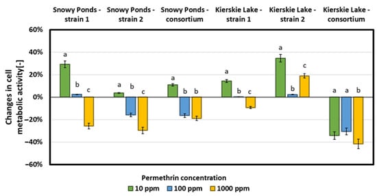 Figure 1 presents the percentage change in the number of cells in relation to increasing the permethrin concentration and shows that an increasing permethrin concentration causes a significant decrease in the metabolic activity of Serratia fonticola KS and Serratia fonticola PS in the consortia from the Snowy Ponds and Kierskie Lake.