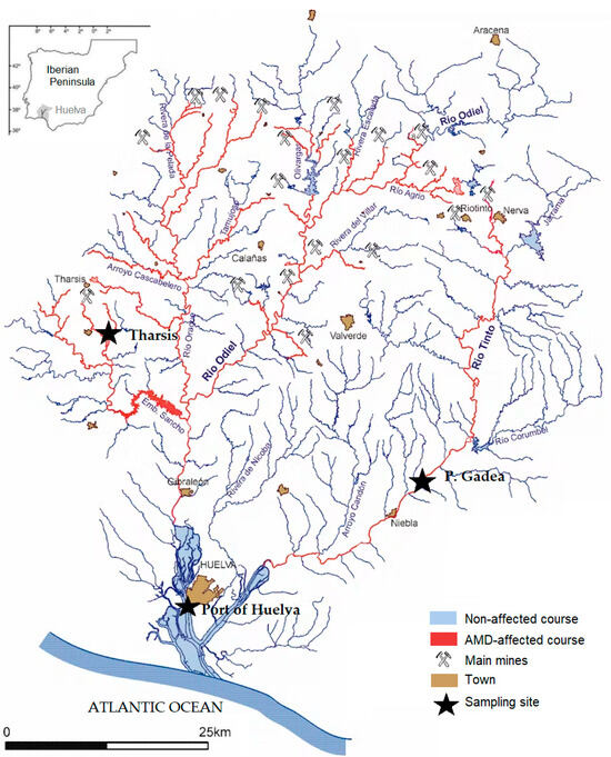 Odiel-Rio Tinto River watershed in the province of Huelva (southwest Spain), the main affected courses according to [35], and the location of the sampling points (Tharsis mine, Puente Gadea/Rio Tinto River and the Port of Huelva-supplier dredged material).