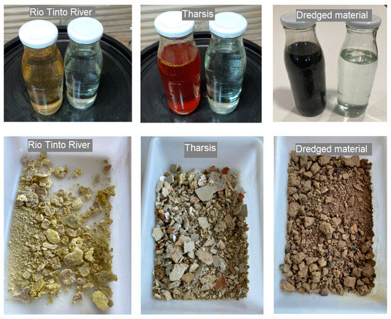 Figure 1 shows the water sample location from mining areas affected by AMD: at Puente Gadea (Rio Tinto river tributary), and the immediacy of Tharsis Mine (Odiel River basin). Samples of dredged material, characterized as highly contaminated and managed as waste products, were provided by the port authorities of the Port of Huelva. Some aliquots of samples were collected in plastic bottles and transported under cool and dark conditions to laboratories where they were analyzed; their physicochemical parameters were determined as outlined in [43].