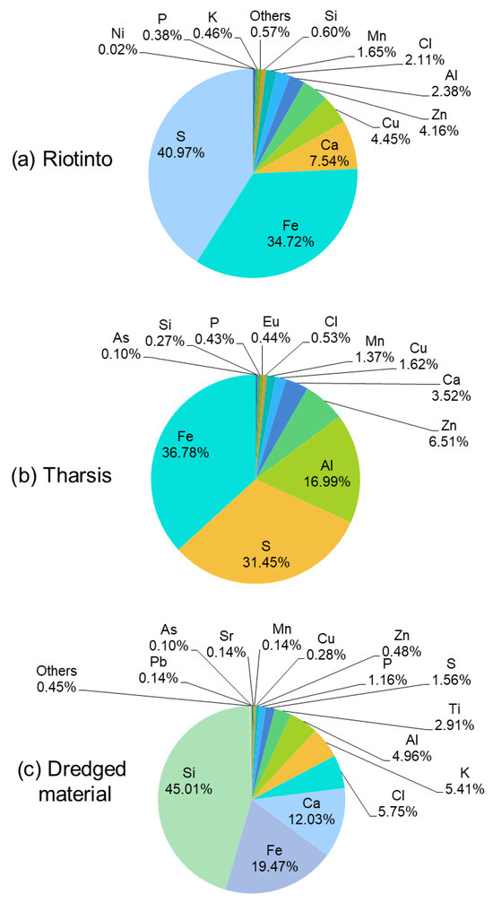 Some elements found in elevated concentrations, such as Cu, Cd, Zn or As, are mainly associated with discharges of the Odiel-Rio Tinto watershed due to mining activity [47]. But the binding of these elements also depends on the pH of elements (Table 1), e.g., for low pH, iron and S are associated with As and Pb. In contrast, the estuarine mixing processes promote the precipitation of Fe and Al oxyhydroxysulfates (pH < 6), so contaminants (Cu, Cd, Zn) are associated with S [48]. The main mineral formations found were anhydrous sulphate of Zn, and other sulphates of Cu, Al, and Fe in the Rio Tinto solid sample. In the Tharsis sample, Fe-sulphides prevailed, along with anhydrous sulphate of Fe, oxyhydroxide of manganese (manganite), sulphate of Zn, and Cu sulphides, among others (Figure 4).