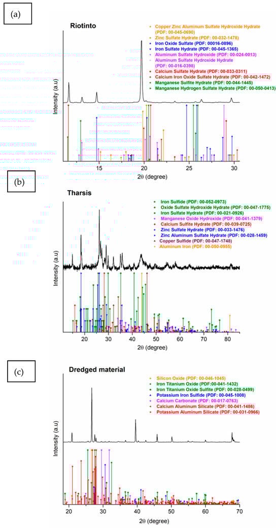 A similar composition was observed for solids collected after the treatment of the Tharsis sample, where the major composition was iron sulphates, and other oxyhydrosulphates, such as Mn, Ca, Zn or Al, but some iron oxides were also detected (Figure 4).