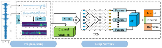 The proposed temporal convolutional network model, incorporating channel attention, primarily consists of three modules: (i) the PPG signal preprocessing module, involving frequency-domain analysis to generate spectrograms; (ii) the scale dimension attention compression module, which applies channel attention to weight each scale’s data, compress it, and provides enhanced attention features for subsequent emotion recognition modules; and (iii) the emotion recognition module, utilizing TCN and GRU to extract spatiotemporal features. The architecture of the network is illustrated in Figure 2.