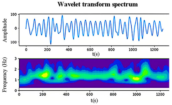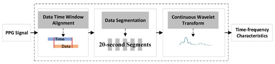 The CWT is employed to conduct time–frequency conversion on the PPG signal data, which is segmented based on the windowing method, in order to generate a spectrogram. During the wavelet transform process, the pre-segmented data W are fed into a CWT function, which processes the data across various scales. Initially, the transform begins at the smallest scale to analyze high-frequency characteristics, with smaller scales corresponding to higher frequencies. Next, as the data scale increases with a doubling exponential factor, the frequency decreases inversely. This methodology enables the analysis of half of the data’s behavior at the highest frequency. As the scale continues to grow, the frequency decreases, and the analysis concludes at the maximum decomposition level. This entire wavelet transform process is carried out using the ‘pywt’ wavelet transform processing package in Python, with the CWT function ‘CWT’ being applied to the segmented data. The result is a multidimensional spectrogram X, which is obtained through the computation of the CWT. The aforementioned process can be represented by the following Equations (2)–(5).