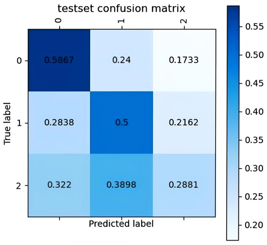 As depicted in Figure 4, the emotions encoded by 0, 1, and 2 correspond to Interest, Neutral, and Bored, respectively. The classification outcomes for the Bored category starkly contrast with those of the other two categories, with the Bored category achieving a low recognition accuracy of 28.81%, and a higher proportion of instances being misclassified as Neutral. This indicates that conventional manual features and machine learning classifiers are inadequate for effective Bored category recognition.