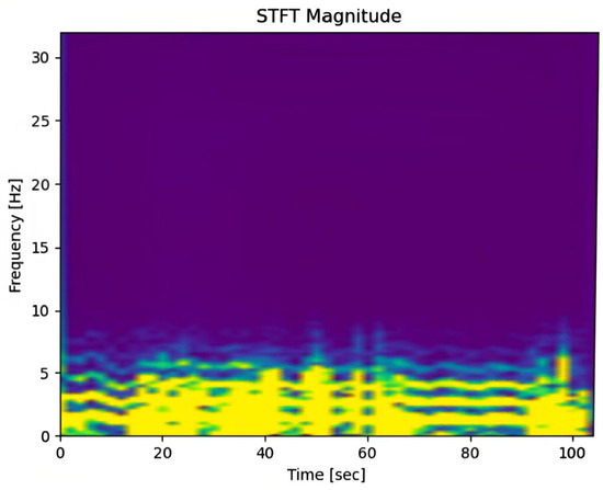 Spectrograms resulting from these analyses are presented in Figure 5 and Figure 6, where Figure 5 shows the spectrogram derived from the STFT (short-time Fourier transform) and Figure 6 from CWT. The experiment further compares the classification performance when applying CWT and STFT. As indicated in Table 2, the original PPG signal data are processed using both CWT and STFT, followed by feeding the processed time–frequency feature data into the TCN + GRU neural network model. Using STFT for PPG data processing results in a training accuracy of 60.00%. This represents a significant improvement over raw data-based one-dimensional neural networks, with an increase of 7.64%. Processing PPG data with CWT and training the model yields an accuracy of 62.43%, which is 2.43% higher than the time–frequency feature processing using STFT. The results suggest that CWT outperforms Fourier transform in time–frequency feature processing. To investigate the reasons, it is observed that PPG signals are susceptible to interference from human movements during acquisition, leading to noise. CWT effectively filters out noise. Additionally, STFT requires setting parameters during its time–frequency processing, such as the size of the time window. STFT divides time into segments based on a set window and calculates the time–frequency characteristics through Fourier transform on each segment. Consequently, it is challenging to determine the appropriate window size. A small window may result in insufficient data signal within the window for accurate frequency analysis, while a large window may lack sufficient granularity in the time dimension, leading to relatively low time resolution. Therefore, CWT offers superior time–frequency characteristics compared to STFT.