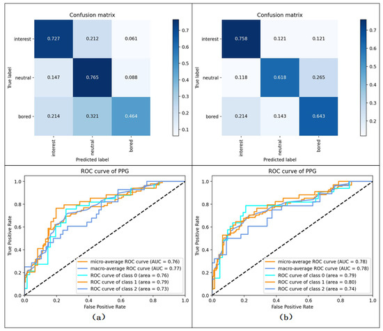 In Figure 7, the x-axis signifies the false positive rate, the y-axis the true positive rate, and the AUC under the ROC curve indicates the enclosed area. Class 0 represents “Interest”, class 1 represents “Neutral”, and class 2 represents “Bored”. The micro- and macro-average ROC curves offer performance measures across all classes. Figure 7 displays the confusion matrix and ROC curve for an emotion recognition experiment involving a temporal convolutional network model with channel attention. Column (a) shows the results for the scale dimension attention compression module following the TCN, while column (b) illustrates results for the scale dimension attention compression module preceding the TCN. Observing the graph, it becomes apparent that the model demonstrates a comparatively strong classification performance for the Interest category, achieving over 72% accuracy. Additionally, incorporating the scale dimension attention compression module before the TCN enhances the differentiation between the Neutral and Bored categories. Both the ROC curve and the AUC area suggest that the model performs better with this module. These experimental outcomes substantiate the requirement for incorporating this module.