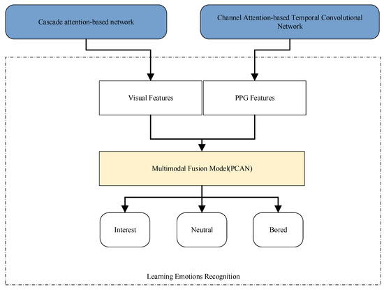 Initially, we utilize channel attention-based temporal convolutional networks for PPG signal emotion recognition. Specifically, (i) PPG signal data are preprocessed using CWT to obtain refined features and signal spectrograms across diverse scales; (ii) channel attention dynamically weights the various scales of the signal to concentrate on the local details of PPG; and (iii) causal convolutions within the TCN are applied to further extract spatiotemporal features, and GRU is used to amplify temporal features, thereby improving the accuracy of emotion recognition. Comparative experimental results indicate that the network model’s accuracy surpasses that of the baseline algorithm, reaching 67.37%. Subsequently, we introduce a network model (i.e., cascade attention-based facial expression recognition network) that integrates multi-scale spatiotemporal video features, previously proposed by our research group. The model first employs a convolutional network for local feature extraction and the generation of multi-scale pyramid spatial features, followed by the application of cascaded attention blocks for feature aggregation and a GRU for the extraction of temporal features. Based on the two single-modal representations discussed earlier, we place additional emphasis on the fusion of dual-modal data to exploit their complementary strengths. Finally, following suitable adjustments and optimizations based on the attention fusion network concept, the fusion model, i.e., PCAN is employed for conducting emotion recognition tasks on the self-collected learner learning emotion dataset. The experimental results reveal that PCAN is particularly effective in handling multimodal feature data, significantly increasing the recognition efficiency of learners’ learning emotions. Additionally, the feature overlay integration method exhibits superior performance, achieving a recognition accuracy of 95.75%, which is 2.07% higher than that achieved with a single video signal. Compared to a single PPG signal, the recognition accuracy has been significantly enhanced, confirming that data fusion can achieve the complementary benefits of different modal data. In the future, we aim to employ adaptive methods for automatic alignment of time dimensions across modalities. This will involve synchronizing the onset, peak, and offset of emotions from different modal data to enhance data representation. Furthermore, we plan to utilize advanced fusion techniques to more effectively improve the accuracy of emotion recognition learning.
