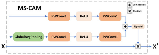 In Figure 10, “Composition” refers to an additive operation, while “Multiply” indicates a multiplicative operation. The video signal Fv and PPG signal Fp are input into PCAN for feature aggregation. PCAN primarily utilizes the Multi-Scale Attention Module (MS-CAM) to process the two types of modal data separately, as shown in Figure 10. This module employs two branches of varying scales to extract channel attention weights. One branch employs GlobalAvgPooling to capture global attention weights, while the other directly uses Pointwise operations to extract local channel attention weights. These two sets of weights effectively distinguish the importance of the original single-modal data features. The specific calculation process of the multi-scale attention modules is detailed in Equations (12) and (13). L(X) represents the first branch in Figure 10, and g(X) represents the second branch.